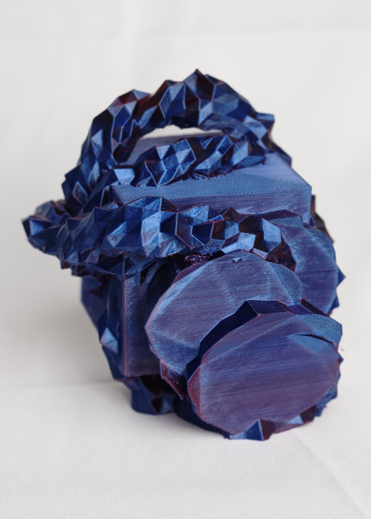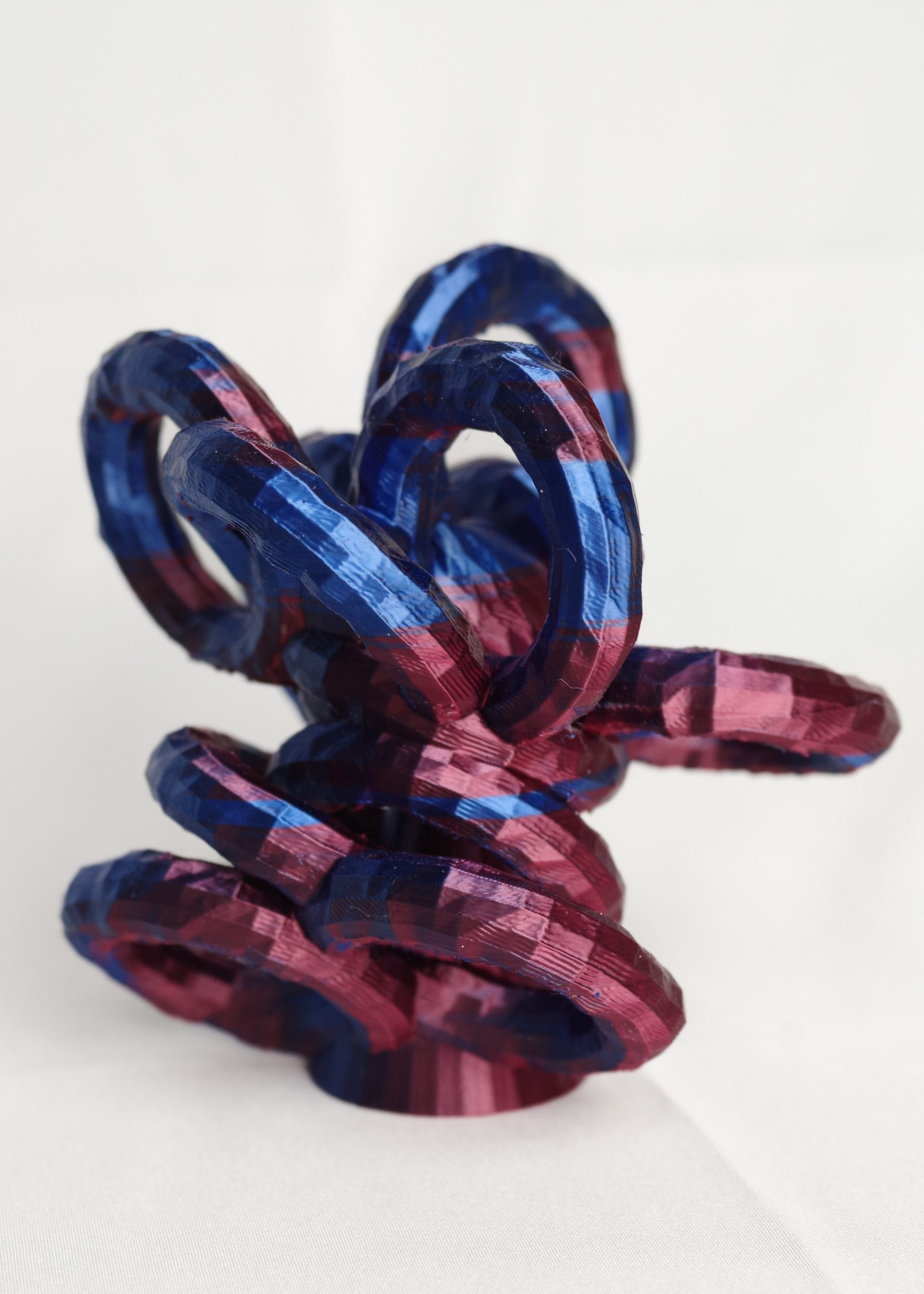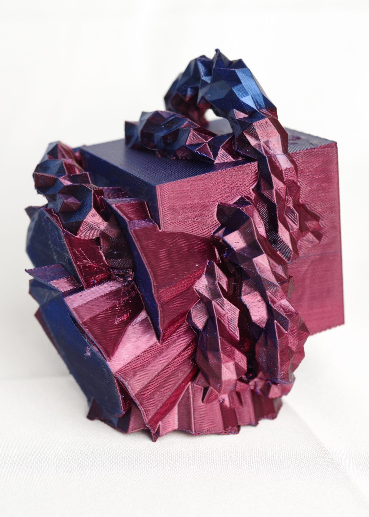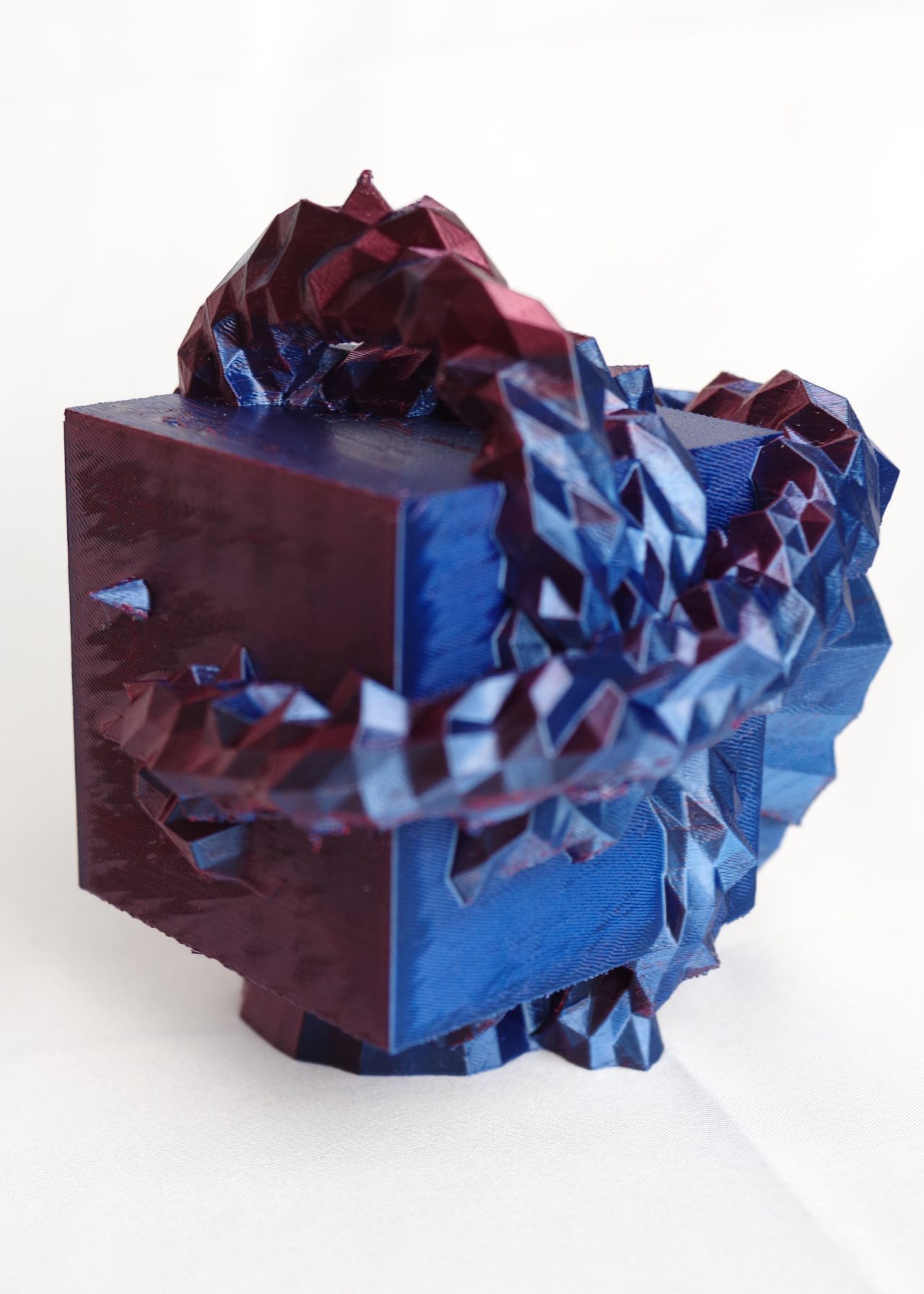 * ExMachina is an AI-powered system designed to conduct psychological tests and translate the results into 3D compositions. The project uses open-source 3D modelling software (Blender) and a suite of custom Python scripts to generate geometry procedurally. The AI logic is trained to arrange data in a way that symbolically reflects key personality dimensions, drawing inspiration from the Big Five model: Openness, Conscientiousness, Extraversion, Agreeableness, and Neuroticism. Each result is a unique abstract form—a visual map of internal tendencies. Final models are printed in biodegradable PLA (polylactic acid) using a desktop FDM 3D printer.